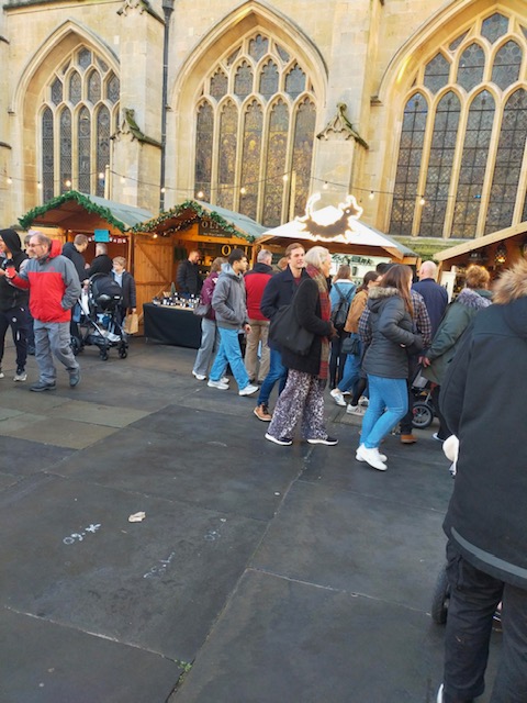 This is an Artisan type market rather than a Victorian market, with stalls standing all around Bath Abbey. There was a carol service in the side streets which they attended, followed by a Wurzell's concert during the evening. The two oldest members of the band are now 85 and 86 years old!